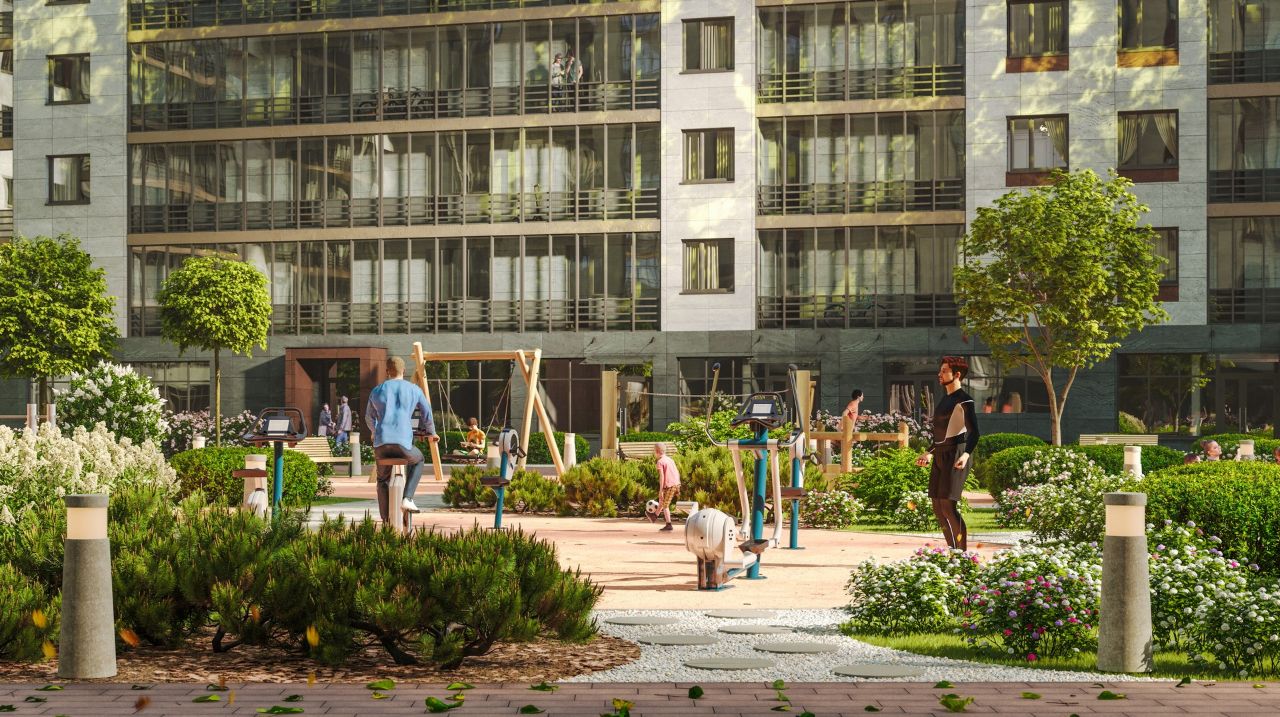 На огороженной охраняемой территории под видеонаблюдением разместится собственный парк площадью 4,2 Га с беседками и зонами отдыха, универсальными спортивными и современными детскими площадками. На первых этажах дома планируются коммерческие помещения, в которых будут все необходимые товары и услуги.